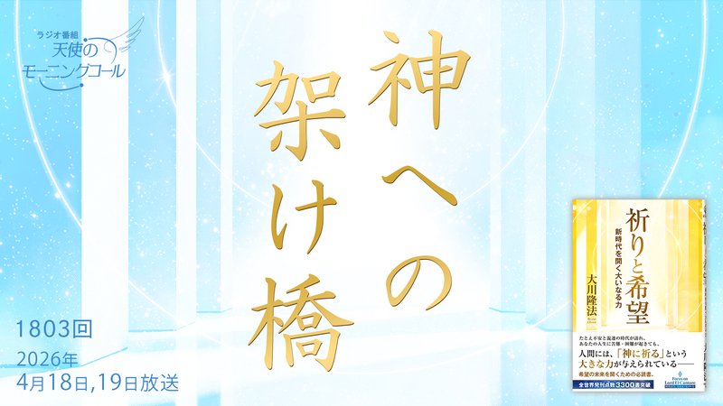人生の中では、自分の力ではどうすることもできないことがあります。しかし、私たちには、「祈り」があり、私たちの心を神の心(宇宙の意思)に合わせて祈るとき、その祈りは最大の力を発揮します。今回は大川隆法総裁の最新刊 『祈りと希望』を紐解きながら、明るい希望の未来を開いていくための祈りの力について、学んでいきましょう。番組後半には、楽曲「未来」(作詞作曲・大川隆法 歌・小原ゆかり)もお送りします。お楽しみに!