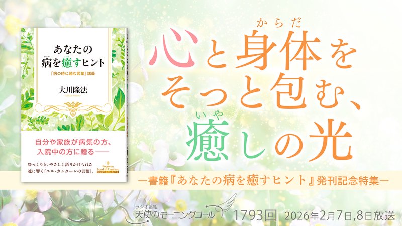 100のヒーリング・メッセージが綴られた書き下ろし箴言集『病の時に読む言葉』は発売以来、多くの方に愛されてきました。今回は、その講義がまとめられた大川隆法総裁の最新刊『あなたの病を癒すヒント』を紐解きながら、体調を崩している方や入院中の方、日常の中で心身の疲れを感じているすべての方へ、「真理の言葉」による癒しの光をお届けします。番組後半には楽曲「光り合う生命。」(作詞作曲・大川隆法 歌・篠原紗英)もお送りします。お楽しみに!